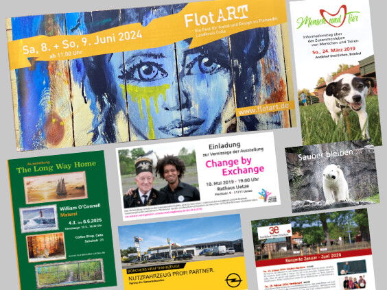 Aufkleber, Banner, Broschüren, Einladungen, Fotobücher, Glückwunschkarten, Handzettel, Kalender, Mappen, Notizblöcke, Plakate, Postkarten, Roll Ups, Speisekarten, Visitenkarten, Zeitschriften ...